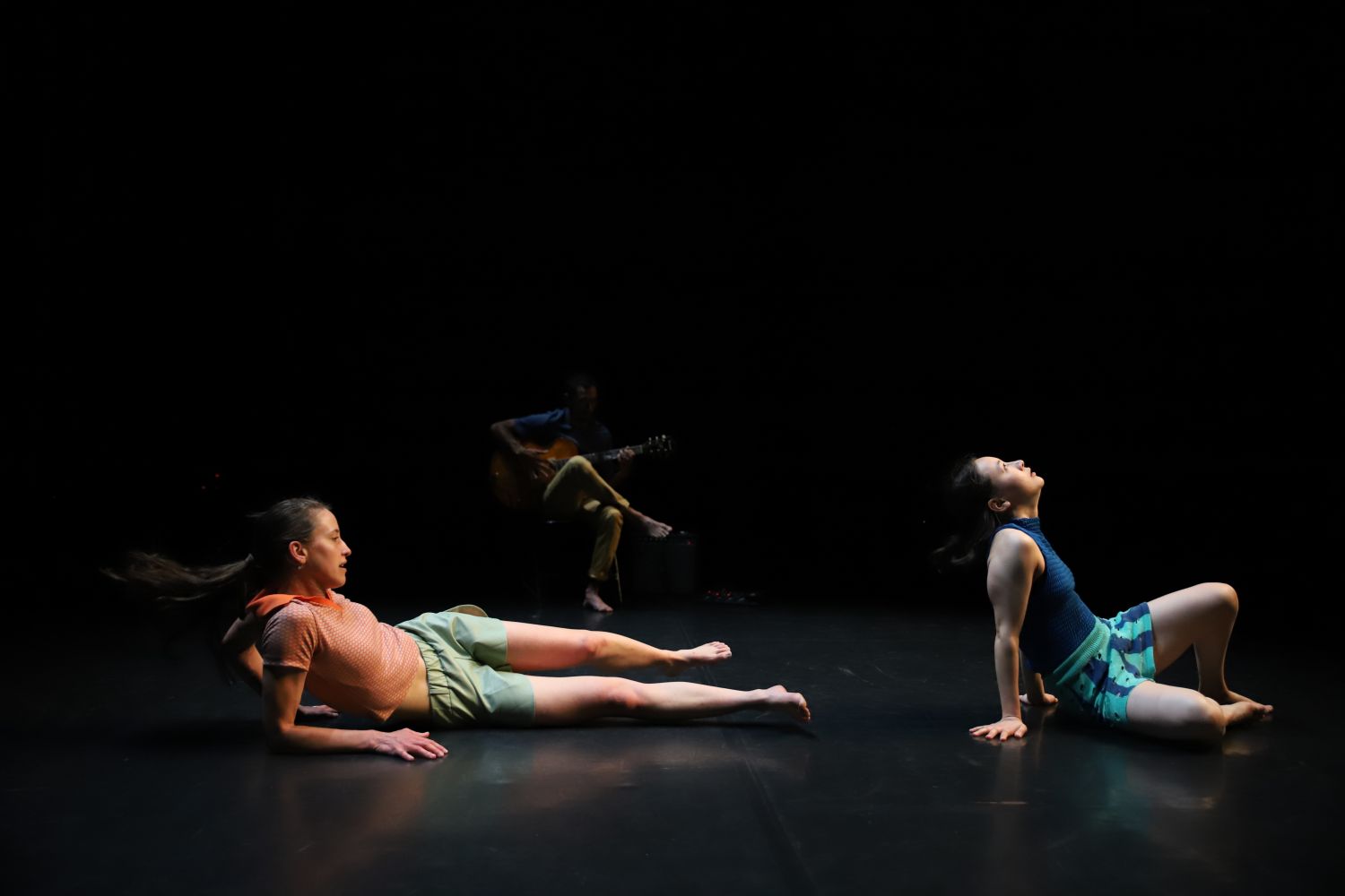 Lia Beuchat : née à Lausanne, elle commence à danser dans cette même ville, puis poursuit sa formation au Centre de Formation Professionnelle Arts à Genève, où elle obtient un CFC de danseuse interprète ainsi qu’une Maturité Professionnelle Artistique. Après un an à Copenhague, elle finalise ses études à Kassel à Sozo vim, où elle découvre entre autres la composition instantanée comme outil de création. Dès lors, elle s'intéresse à comment la création peut prendre forme à travers les corps des interprètes et la musique live. Depuis 2016 elle collabore avec le guitariste Mickael Luis. Ensemble, il-elles explorent l’improvisation et comment mettre la danse et la musique en scène, sans hiérarchie. Parallèlement elle travaille en Allemagne pour les compagnies “Sozo vim. Company” et “Bodytalk”. En 2023, Lia chorégraphie pour la pièce de théâtre “La Goutte” de “In Piazza Production”.