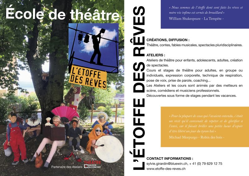 L’étoffe des rêves propose à des enfants et adolescent·e·s des Ateliers de créations théâtrales, pour finir par une ou plusieurs créations et des représentations au théâtre de la Maison du Concert. L'étoffe des rêves et le théâtre de la Maison du Concert offrent des conditions de créations à la fois inclusives, optimales et exigeantes, le tout encadré par des professionnel·le·s des Arts de la scène. Chaque jeune acteur·trice à l’occasion de jouer dans un véritable théâtre et contribue ainsi à la vie du théâtre de la Maison du Concert. Si d'année en année chaque groupe d'âge mène à terme son propre spectacle, les Ateliers se veulent aussi rassembleurs lors de spectacles événementiels réunissant tous·tes les jeunes acteurs·trices dans une même aventure.